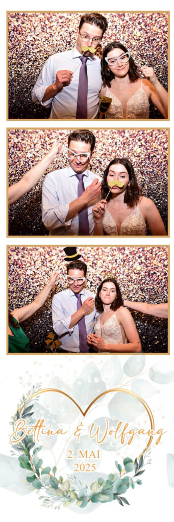 Personalisierung macht den Unterschied! Ihr könnt den Hintergrund eurer Fotostreifen individuell auswählen: von romantischen Blumenmustern über elegante Designs bis hin zu thematischen Motiven passend zu eurer Feier. Auch die Streifen selbst können mit eurem Namen, Hochzeitsdatum oder einem persönlichen Logo gestaltet werden. So wird jedes Foto zu einem kleinen Kunstwerk, das perfekt zu eurem Event passt und die Erinnerungen noch einzigartiger macht.